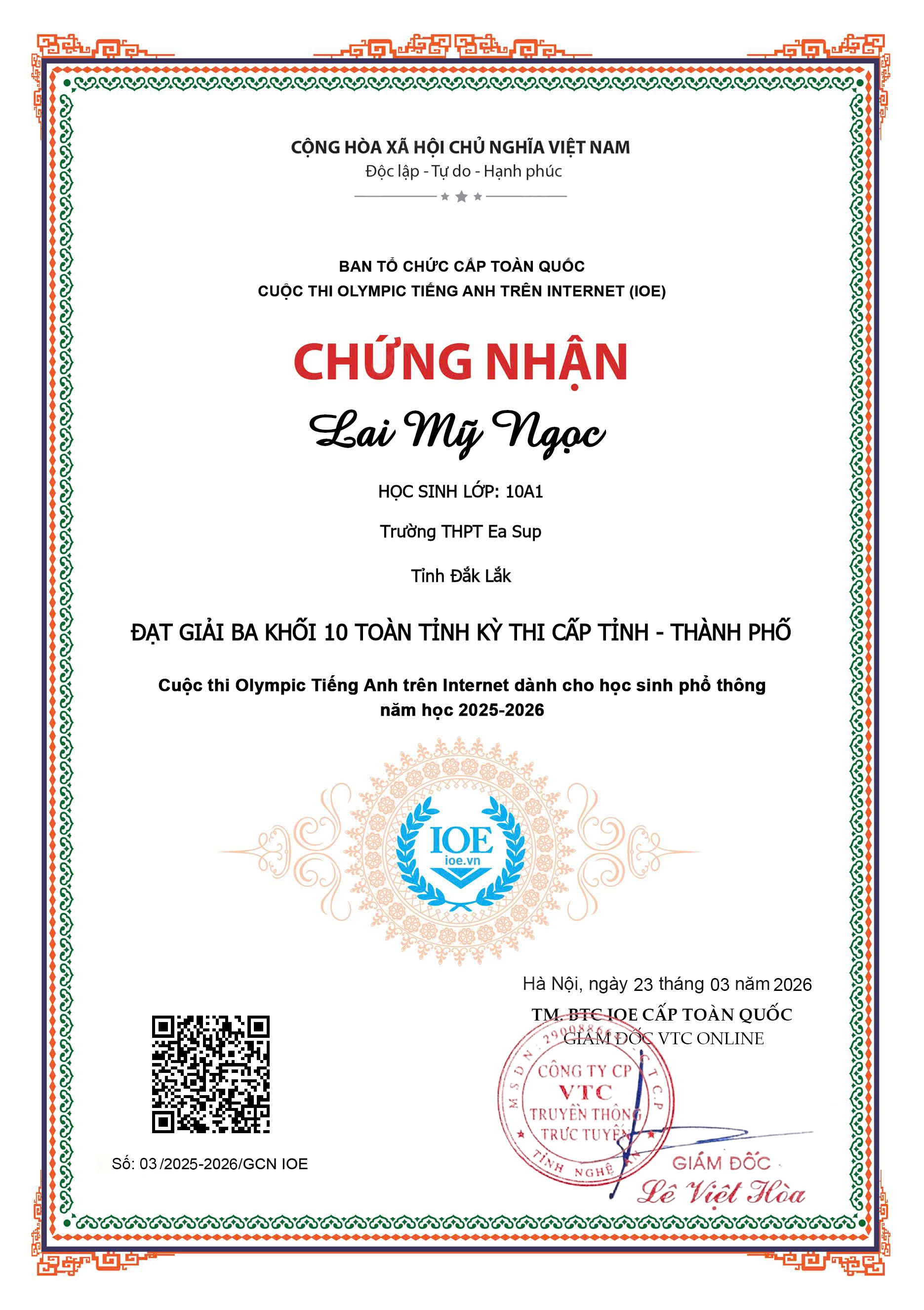 2. Em Lai Mỹ Ngọc (Lớp 10A1): Đạt Giải Ba khối 10 toàn tỉnh.