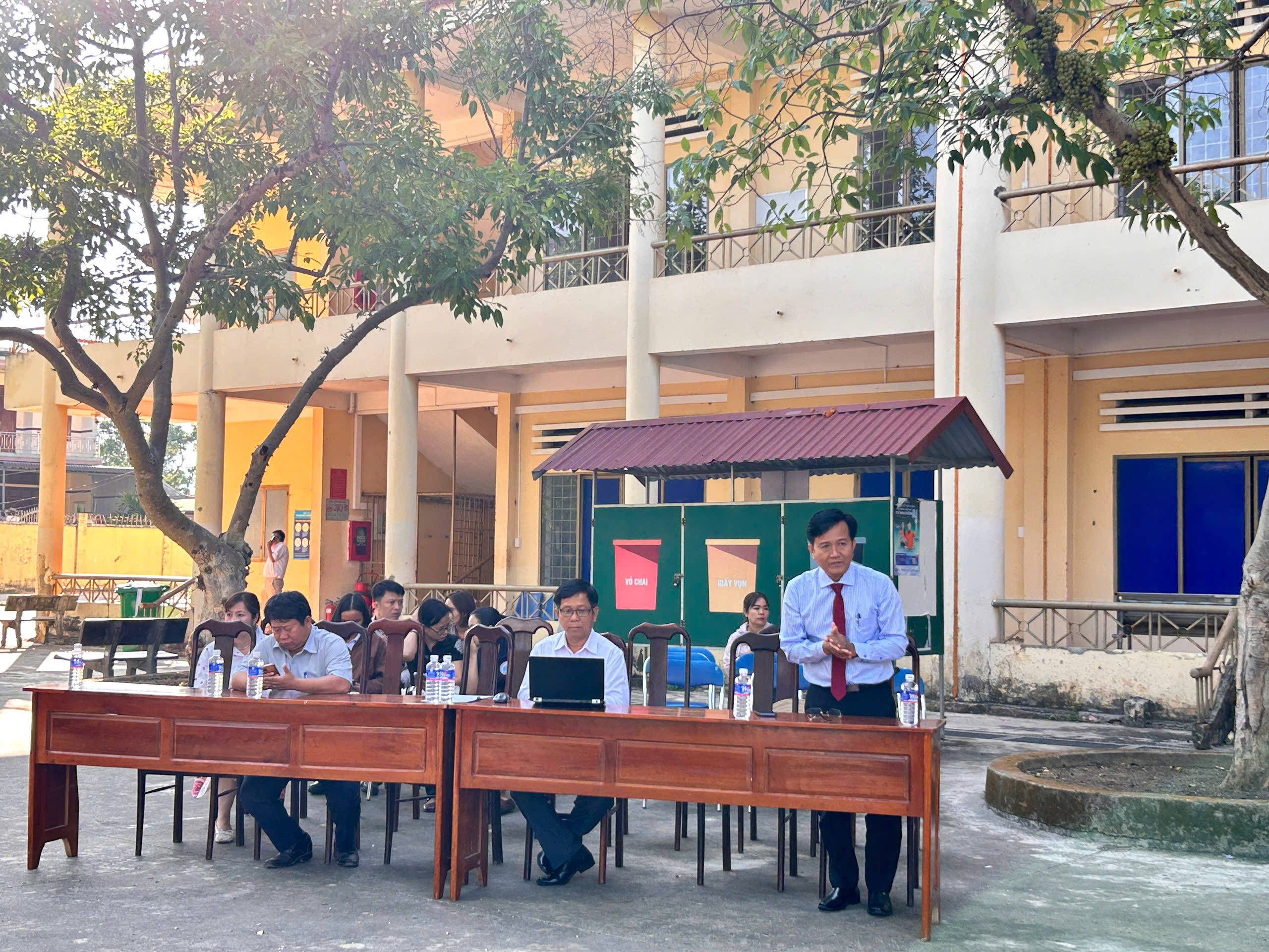 Thầy Huỳnh Trung Hiếu, Phó bí thư Đảng bộ, Phó hiệu trưởng nhà trường phát biểu, dặn dò.