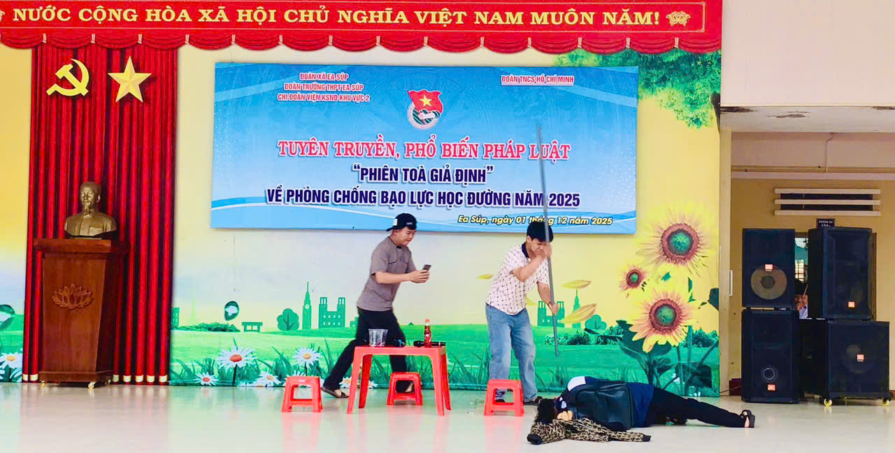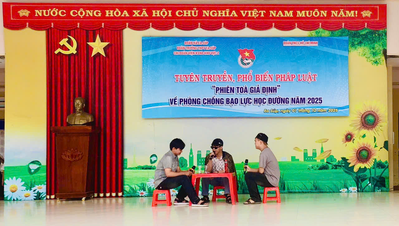 Sáng ngày 01/12/2025, trường THPT Ea Súp tổ chức sinh hoạt dưới cờ tuần 14. Nổi bật trong buổi sinh hoạt tuần này là chương trình “PHIÊN TOÀ GIẢ ĐỊNH” do Đoàn trường THPT Ea Súp phối hợp với Chi đoàn VKSND khu vực 2 thực hiện.