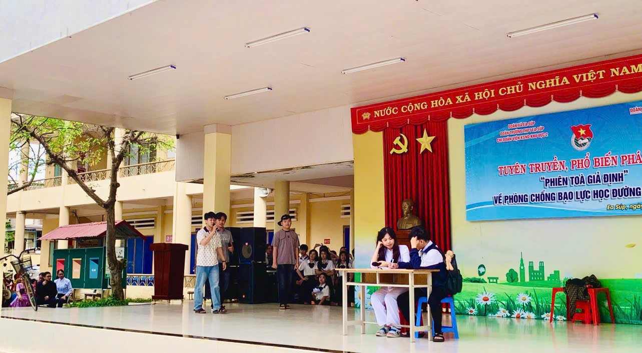 Mở đầu chương trình là các tiết mục văn nghệ do CLB Văn nghệ trường THPT Ea Súp thực hiện. Tiếp đến là Phiên toà giả định. Phiên tòa được xây dựng từ tình huống Cố ý gây thương tích trong lứa tuổi học sinh. Tiểu phẩm do chính các em học sinh biểu diễn, tái hiện mâu thuẫn học đường và những hệ lụy pháp lý. Các đoàn viên Chi đoàn đảm nhiệm các vị trí trong phiên tòa, thể hiện đúng tác phong, góp phần truyền tải thông điệp “Nói không với bạo lực học đường”.
