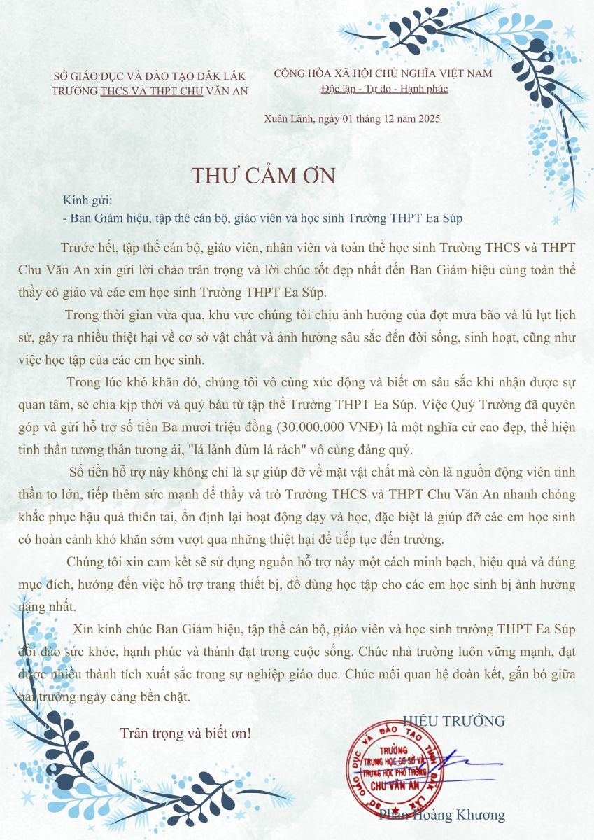 TRƯỜNG THCS VÀ THPT CHU VĂN AN GỬI THƯ CẢM ƠN BAN GIÁM HIỆU, GIÁO VIÊN, NHÂN VIÊN VÀ HỌC SINHTRƯỜNG THPT EA SÚP