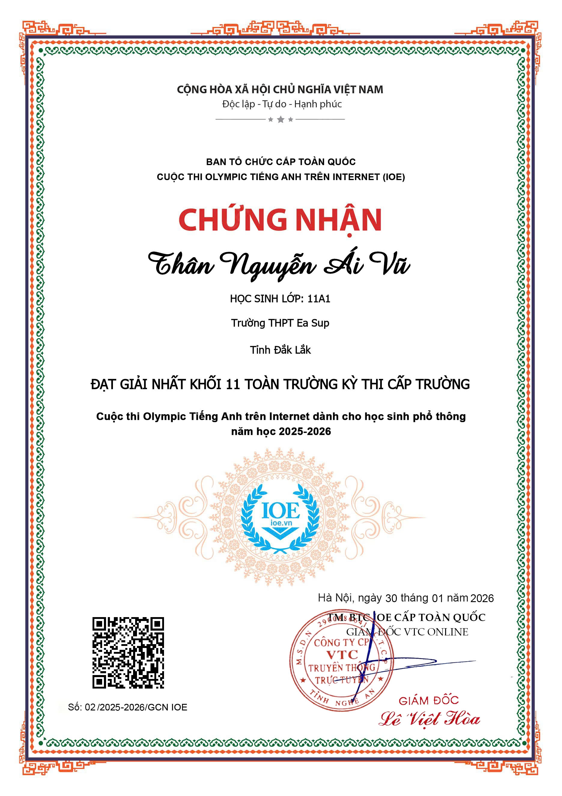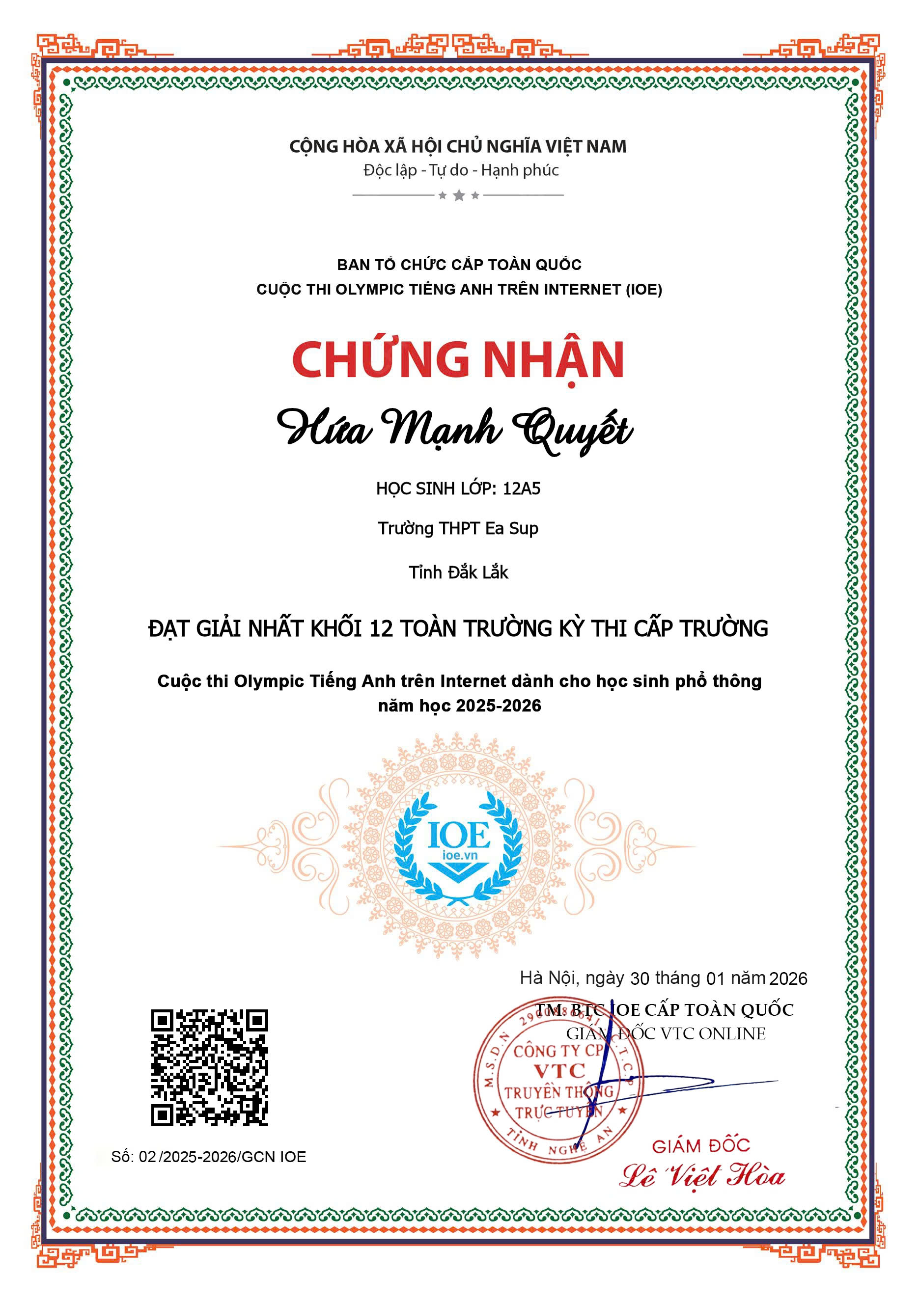 Những tấm giấy chứng nhận từ Ban Tổ chức cấp Toàn quốc chính là minh chứng cho sự nỗ lực không ngừng nghỉ, tinh thần tự học và niềm đam mê mãnh liệt với môn Tiếng Anh của các em. Đây không chỉ là niềm tự hào cá nhân mà còn là nguồn cảm hứng lớn lao cho phong trào học tập ngoại ngữ của toàn thể học sinh trường THPT Ea Súp.