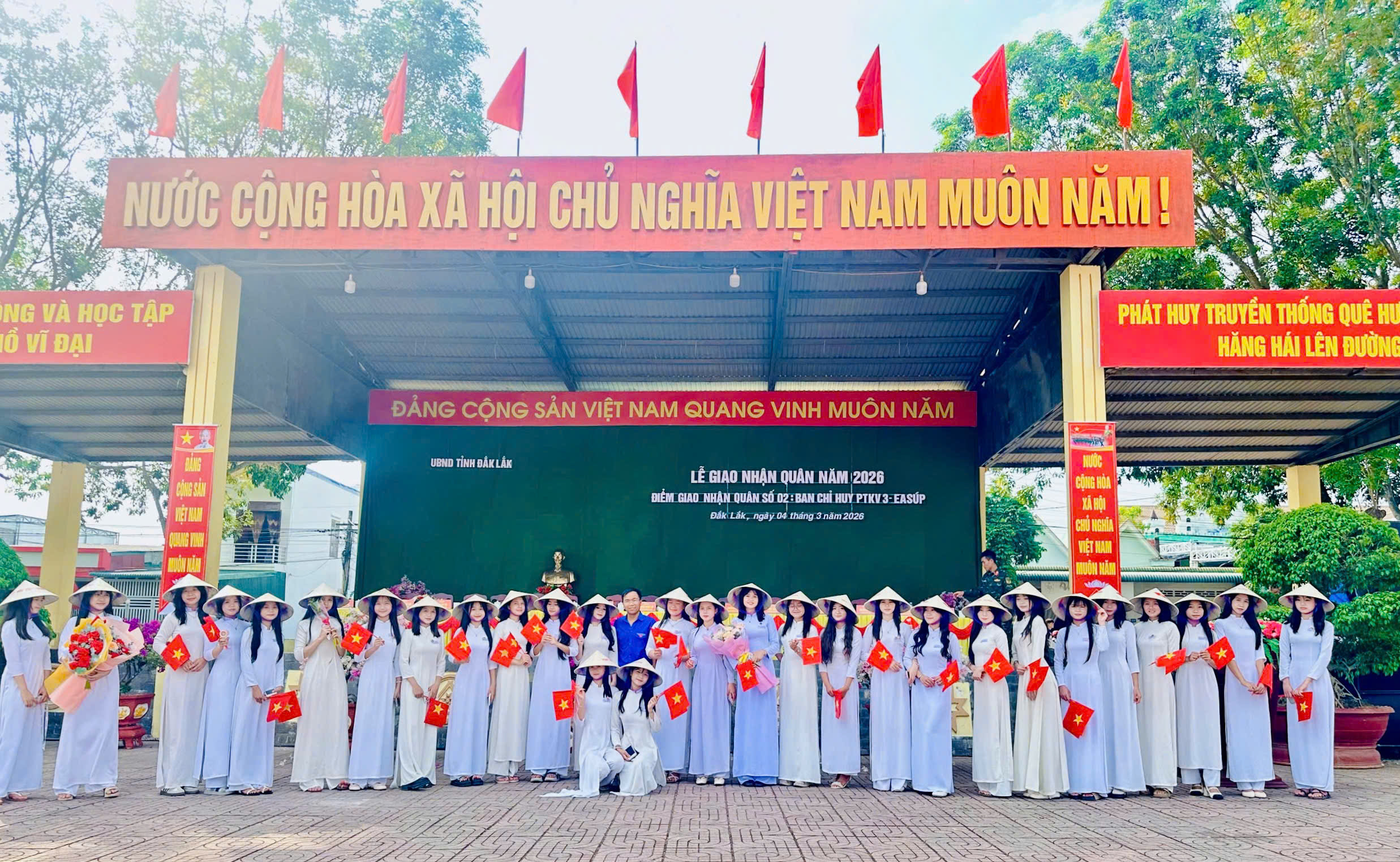 Trong tà áo dài trắng thướt tha cùng chiếc nón lá truyền thống, các nữ sinh đại diện cho Đoàn trường THPT Ea Súp đã mang đến sắc màu tươi trẻ, dịu dàng nhưng đầy ý chí. Những bó hoa tươi thắm cùng những lời chúc tốt đẹp đã được trao tận tay các tân binh, gửi gắm niềm tin yêu và kỳ vọng của nhà trường đối với những học sinh, thanh niên ưu tú của quê hương.